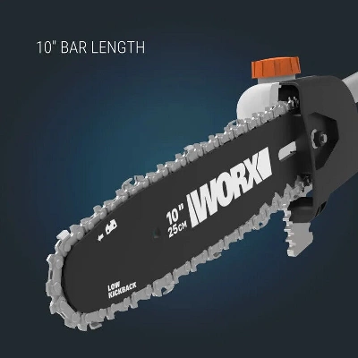 The Worx Nitro WA0222 Driveshare 10” Universal Pole Saw Attachment is the easier, safer, better way to prune hard-to-reach tree branches and limbs. Part of the powerful Nitro Series of tools, which boast gas-like performance but use clean, cost-effective battery power, and one of the attachments in the Driveshare system that turns the Worx Nitro 40V Grass Trimmer (sold separately) into a complete lawn and property detailing all-in-one tool. This Pole Saw attachment features a high-speed 10” bar & chain for a professional-grade user experience. The bar is longer than other Pole Saw attachments on the market, so it has the capability to cut through thicker branches and limbs. It operates at 55.8 ft./s. with a .043 in. chain gauge and a 3/8 in. pitch. The chain itself is 40 links and the entire attachment weighs only 4.06 lbs. so it’s easy to hold up high for long stretches. This Universal Pole Saw Attachment is compatible with other brands’ attachment-capable systems, like Ryobi, Craftsman, Troy-Bilt, and TrimmerPlus. Just as the attachments from those brands fit the Worx Nitro 40V Driveshare String Trimmer. So you can mix and match in a way that’s convenient for you. Leave the ladder in the garage when you trim your trees and stay safely on the ground. The included extension pole allows for a total of 12.5 ft. of extra reach, which is longer than other similar products on the market.