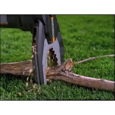 With a fully-enclosed bar and chain, the Worx 6” 20V JAWSAW™ Chainsaw is the safest chainsaw you can buy. The bar and chain actually retract into the neck of the tool when not in use, so you’ll never have a bare chainsaw just lying around the yard. And when in use, the thick protective housing prevents the blade and chain from ever getting outside of it. The bar moves up and down to accommodate branches up to 4” thick, but far less of the chain is ever exposed. Plus, the housing acts as prop for cutting branches on the ground. With a traditional chainsaw, you have to prop them up first to safely cut them, but with the JAWSAW, you can get to work on fallen branches right from the grass or pavement.It’s lightweight, less than 8 lbs, so it’s easy to hold up high and cut above your head. As a matter of fact, it’s compatible with our 5-foot pole attachment (sold separately), so you can trim tree limbs without having to get on a ladder. That’s safer, too. And the auto-tension and auto-oiler systems will keep the chain operating at optimum levels throughout the life of this tool.This model comes with a 20V 2.0Ah battery and 0.4A charger, which you can use to operate any tool on the Worx Power Share platform. So the next time you buy a tool, you probably won’t need to buy a new battery.