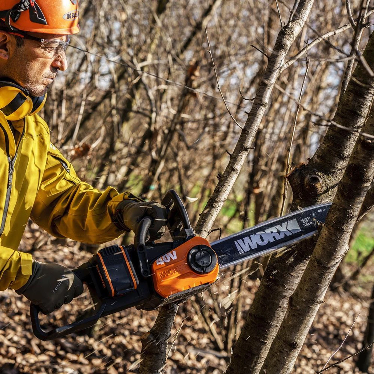 The Worx WG384E boasts a highly efficient brushless motor for long lasting power and performance. A generous 35cm bar makes light work of branches and wood. A safety quick stop chain brake stops accidental cutting. Automatic tool free chain tensioning and automaic chain lubrication for easy continious use and extended bar and chain life.
