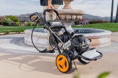 The Worx 13-Amp Electric 2200 PSI Pressure Washer generates enormous cleaning power for dirt and grime removal around the exterior of the home or property. It produces 2000 PSI (2200 PSI MAX) and 1.2 GPM (1.4 GPM MAX) to make quick work of cleaning the driveway, deck, siding, or brickwork. It’s also a great tool for blasting mud out of outdoor camping or sporting equipment or for muddy cars and SUVs. And the onboard soap tank and included soap nozzle allow you to add detergent right into the stream for the dirtiest applications. This pressure washer also comes with a turbo nozzle, when you need maximum pressure, say, for brickwork, and 40-degrees and 25-degrees nozzles for when you need a lighter touch. Plus, the universal ¼ in. quick-connect adapter makes switching between nozzles a breeze. But the best part about this pressure washer may be that it’s easy to use. Not only does it have a pair of rugged wheels to make it quicker to cart around, even over rough terrain, almost anyone can handle all this power. The Worx Electric 2200 PSI Pressure Washer won’t knock you over while still delivering a mighty force of water, thanks to its powerful 13-Amp commercial-grade brushless induction motor. And when you’re finished pressure washing for the day, onboard storage for the nozzle and wand and the hose reel & cord-wrap make cleanup quick and easy.